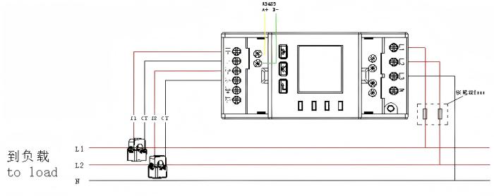 Single phase three wire connection with CTs: