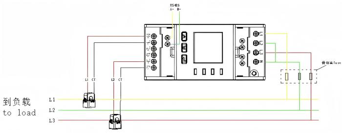 Three phase three wire connection with CTs:
