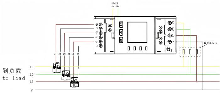 Three phase four wire connection with CTs: