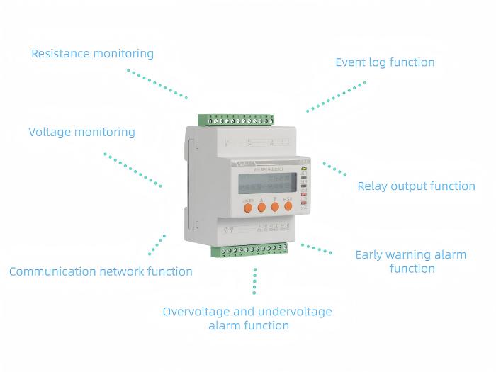 • Resistance monitoring. The product can monitor the insulation resistance of the positive and negative poles of the DC system to ground. When the insulation resistance is lower than the set warning and alarm values, it can send out warning and alarm signals;